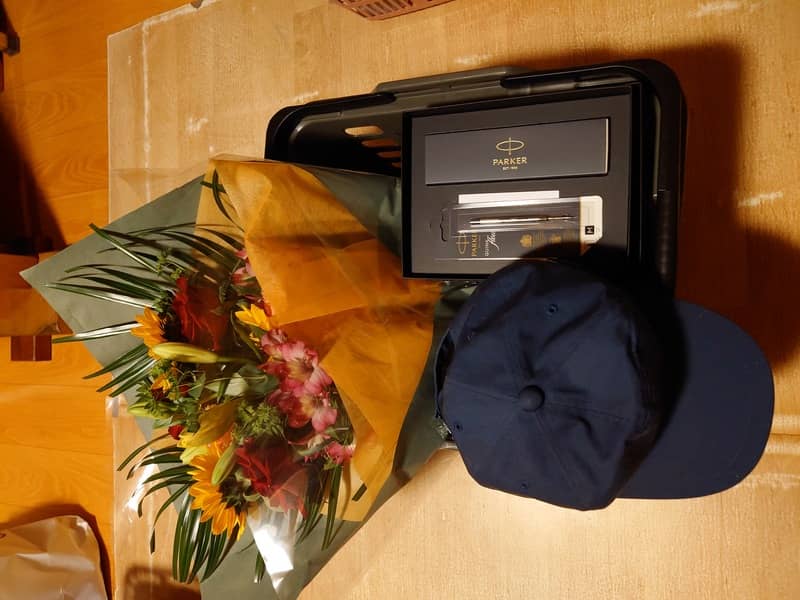 花束と、長い間同じグループで仕事をさせていただいた同僚の皆様から、お餞別の品を頂きました。トップの写真はその画像です。花束なんて、人生で初めて頂きました。そして同僚からいただいたペン。私はペンを無くす人なので(汗) 持ち歩くのではなく、机にキッチリ入れて大事に使わせていただきます。
